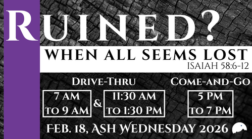 Wednesday: Ash Wednesday, Drive-Through 7A - 9A & 11:30A - 12:30P, Come-and-Go Service 5P - 7P